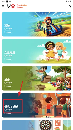 3、进入选择你想玩的游戏类型,比如街机。