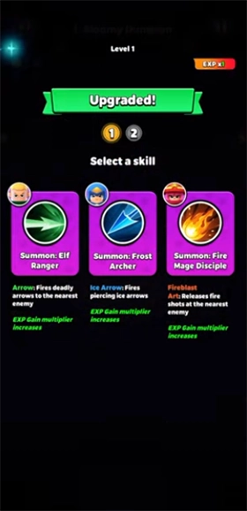 2. 击杀怪物能够获取经验值,每当积累的经验值足以提升一级时,就可抽取一次技能升级选项,依旧是经典的三选一模式。