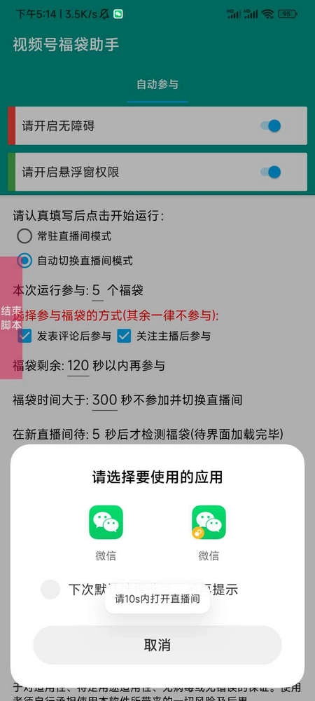 4、防卡顿机制:为防止因参与福袋失败而致使软件出现卡顿情况,软件了智能判断功能,当福袋剩余时间过短时,软件将不参与福袋活动,以此确保软件运行流畅。