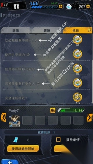 4、特殊动作。这些动作是角色特有的,就像是魔法增益卡。这些卡牌比攻击动作更有效,在内测中,他们都会受到气功的伤害。某些角色也有通过使用他们的“主要能力”获得的第二个特殊动作。而且这四种技能都可以附加一个龙珠,如果你收集了其中的七个,龙珠图示就会变化,RISING RUSH按钮也会随之出现!点选RISING RUSH按钮。