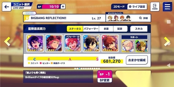这个是与歌曲不同色的队伍配法,总战力为:681270