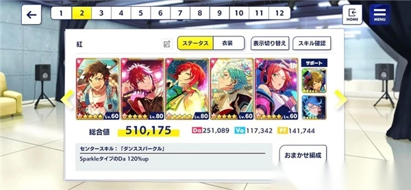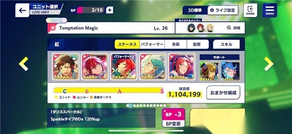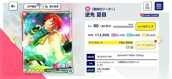 那我们所有队员就必须是「Sparkle类型」和「特化能力值为Da」的卡片,就出现以下组合:会发现队伍皆为Sparkle ,且最高特化值为Da ,这样所有队员都可以吃到夏目的队长技,且能力值最大化。而这就是「同特化能力」的组法。