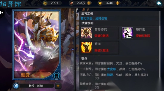 点评:最强的护盾技能,笑傲群雄。大部分武将都是靠技能攻击杀人,所以小霸王的这个护盾可谓真·盾。虽然觉醒困难,但在你的所有武将觉醒之前,他还是能用很久的。