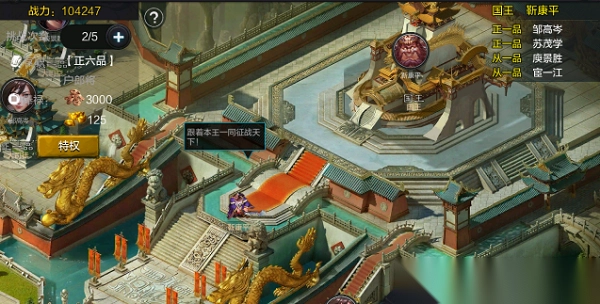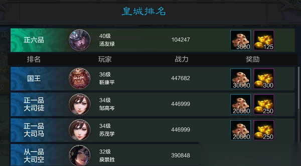 主城中选择皇城可参与皇城争霸玩法,在这里,本国各位主公靠实力来决定各位的官阶,从国王、正一品到九品不等,其中每个国家国王只有一名,其余 各官阶数量不等。