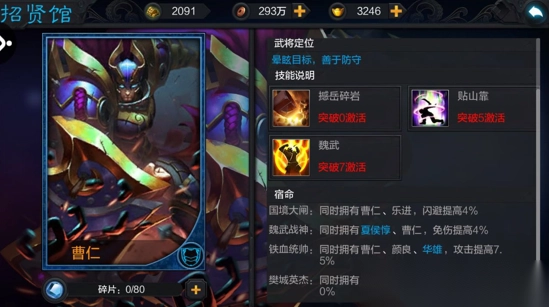魏武:受到伤害时,提高自身闪避3%,持续3回合,最大叠加5层;