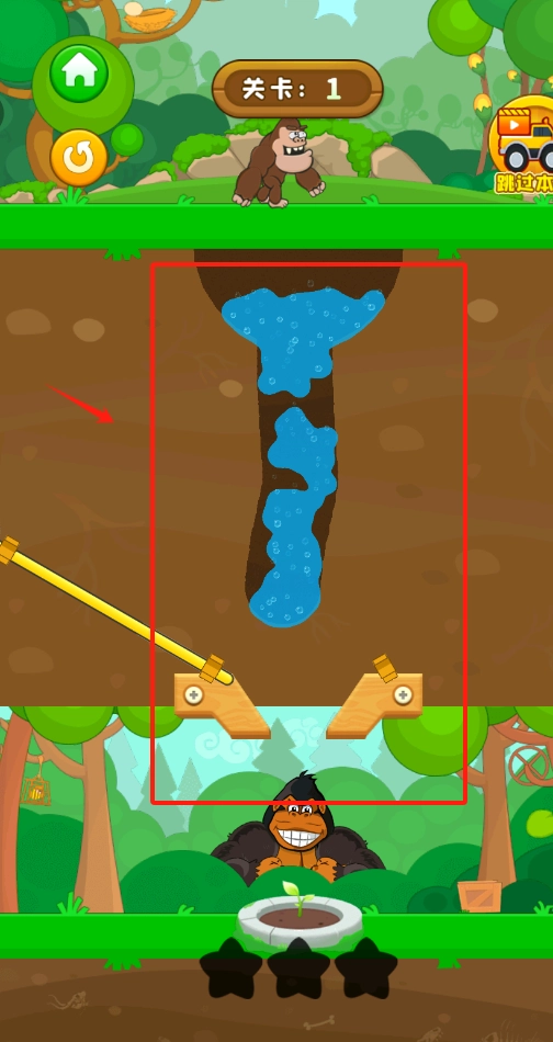3、滑动屏幕调整水流方向,帮助猩猩顺利通过关卡,注意观察地形变化。