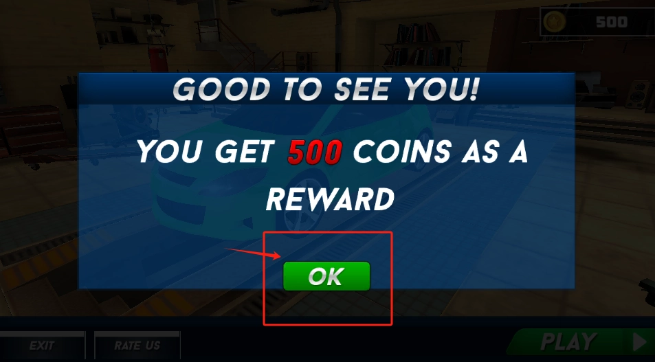 1、看到500金币奖励弹窗,点红圈里的绿色OK按钮领取。