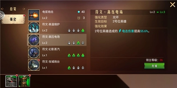3、技能强化:使用金币提升英雄主动技能的等级,技能等级影响技能伤害系数及技能强度。