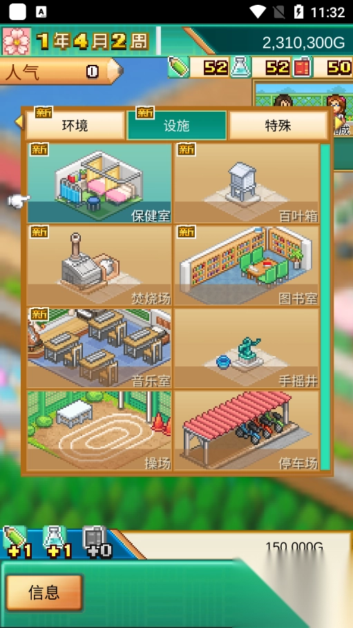 6、在建造界面,包括环境、设施、特殊等分类,选择【设施】选项;这里包括保健室、百叶箱、图书馆、音乐室、操场等建筑,以【保健室】为例;