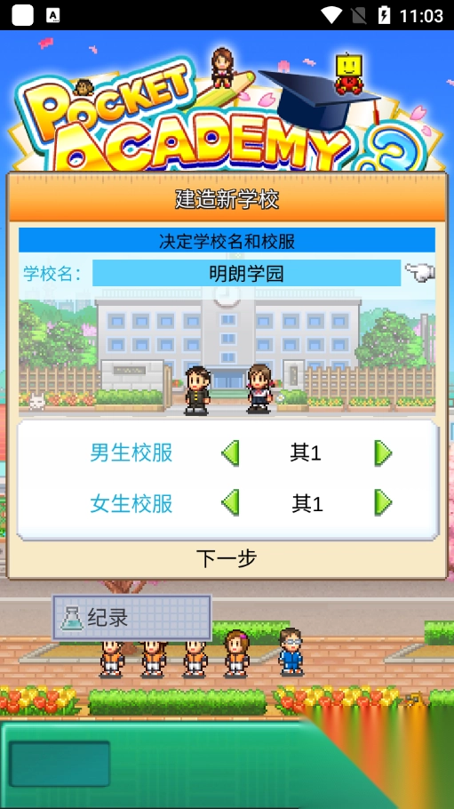 2、开始创建新学校,玩家需要创建学校名,设定好男生和女生的校服,然后点击下方的【下一步】;
