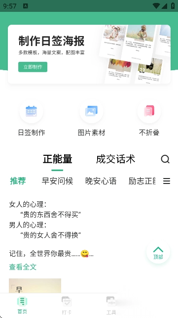 早安语录,一款精心为文字爱好者、文案工作者以及社交媒体用户量身定制的每日励志心语软件。该软件主题分类丰富多样,包含早安心语、晚安心语、励志语录、情感句子、节日祝福、唯美台词等。同时,软件还搭配了精美的图片,具备生成打卡卡片的功能,能一键分享至朋友圈或其他社交平台。每日会持续更新大量金句,助你轻松获取灵感,随心表达心情,提升文字的感染力,无疑是打造朋友圈高人气、激励自身成长的理想工具!