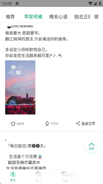 早安语录,这是一款独具特色的知性文字应用,它融合了正能量文案推荐、日常心情表达以及高清美图打卡等功能。在这里,每天都会为你推送一句励志又暖心的早安文案,助你开启元气满满的崭新一天。