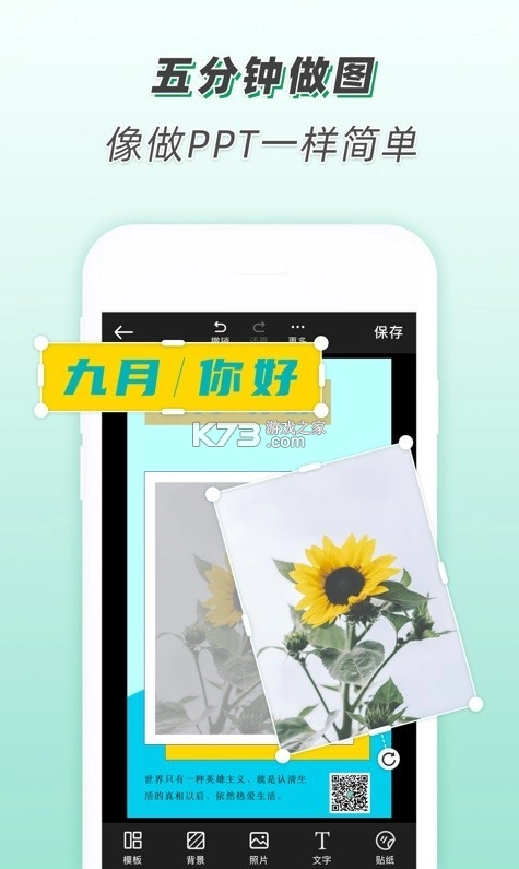 青柠设计APP,无需PS基础,也无需设计基础,能让你在1分钟内找到合适的优质设计模板,5分钟内完成常用设计,是一款出色的海报设计软件。这款软件内含有海量模板,像手机海报、节日海报、日签、营销长图、电商banner、店铺首页、公众号封面、名片、Logo等等。同时,还具备丰富素材,其中有1W +优质图片、插画,以及80多种字体。不仅如此,它还拥有超多编辑功能,支持新建画板设计,有多种花字特效、众多图文组合样式,并且支持对图片进行多种边框和滤镜效果处理。