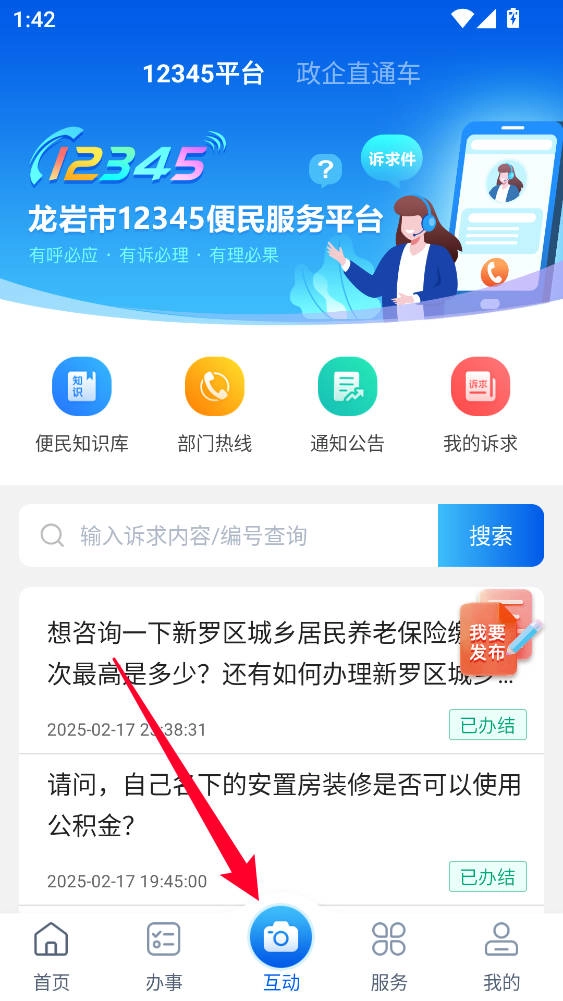 3、轻点底部的“互动”按钮,即可进入12345平台页面,在此页面能够发布诉求,同时还能查看通知公告以及便民热线信息。