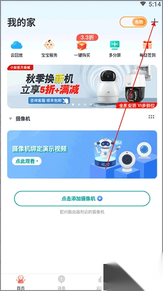 1. 开启小蚁智能摄像机应用程序,轻点右上角的“+”。