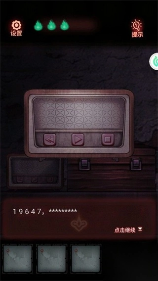 9、按照顺序依次点击收音机上的按钮,点击顺序为【中、右、中、左】,点击完成后会获取到密码【19647】。请注意,每次点击按钮前,需听完对应的语音内容,最后获取到密码的语音也务必听完,在此过程中,不要关闭游戏声音或手机声音。