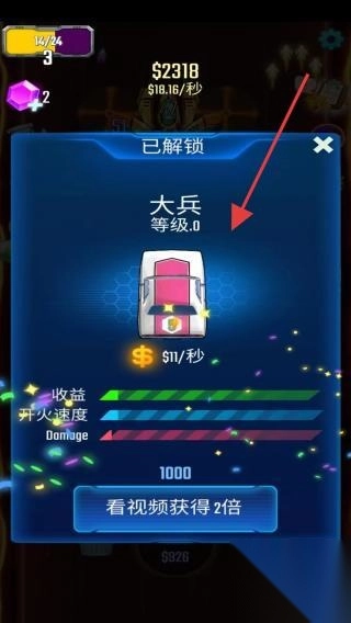 3、用金币买“大兵”等车,看视频翻倍收益,快速攒资源,解锁高阶战车、武器。