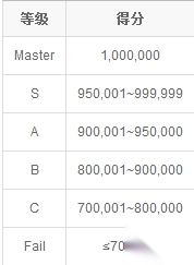 而每首曲子完成后会根据得到的总分来评定等级。共有六种等级,由好到坏依次为:Master、S、A、B、C、Fail