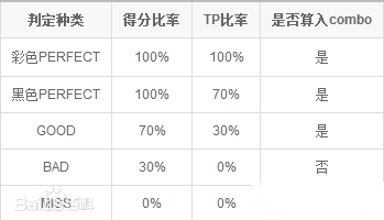 游戏共有五种判定,由好到坏依次为:彩色PERFECT(不会直接反映在结算画面上,但会算进TP里)、黑色PERFECT、GOOD、BAD、MISS,不同音符包含的判定不一样。