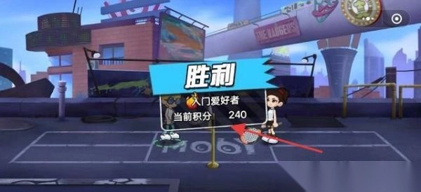 2、加载竞技流程进入比赛,操控紫发戴眼镜的卡通角色,在城市球场的屋顶与街道区域,和对手展开对战。若能获胜,可提升积分(当前积分240)以及段位(目前段位为入门爱好者)。