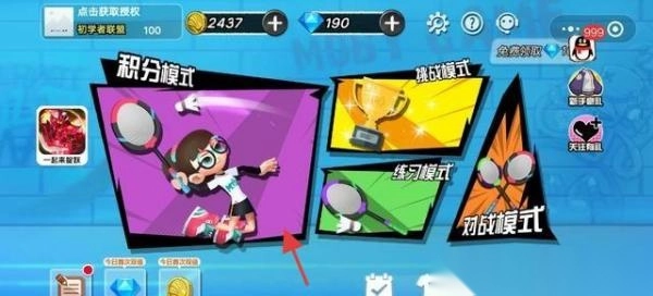 1、模式选择含“积分模式”“排位模式”“练习模式”“对战模式”,消耗金币(2437)、钻石(190),选择对应玩法。
