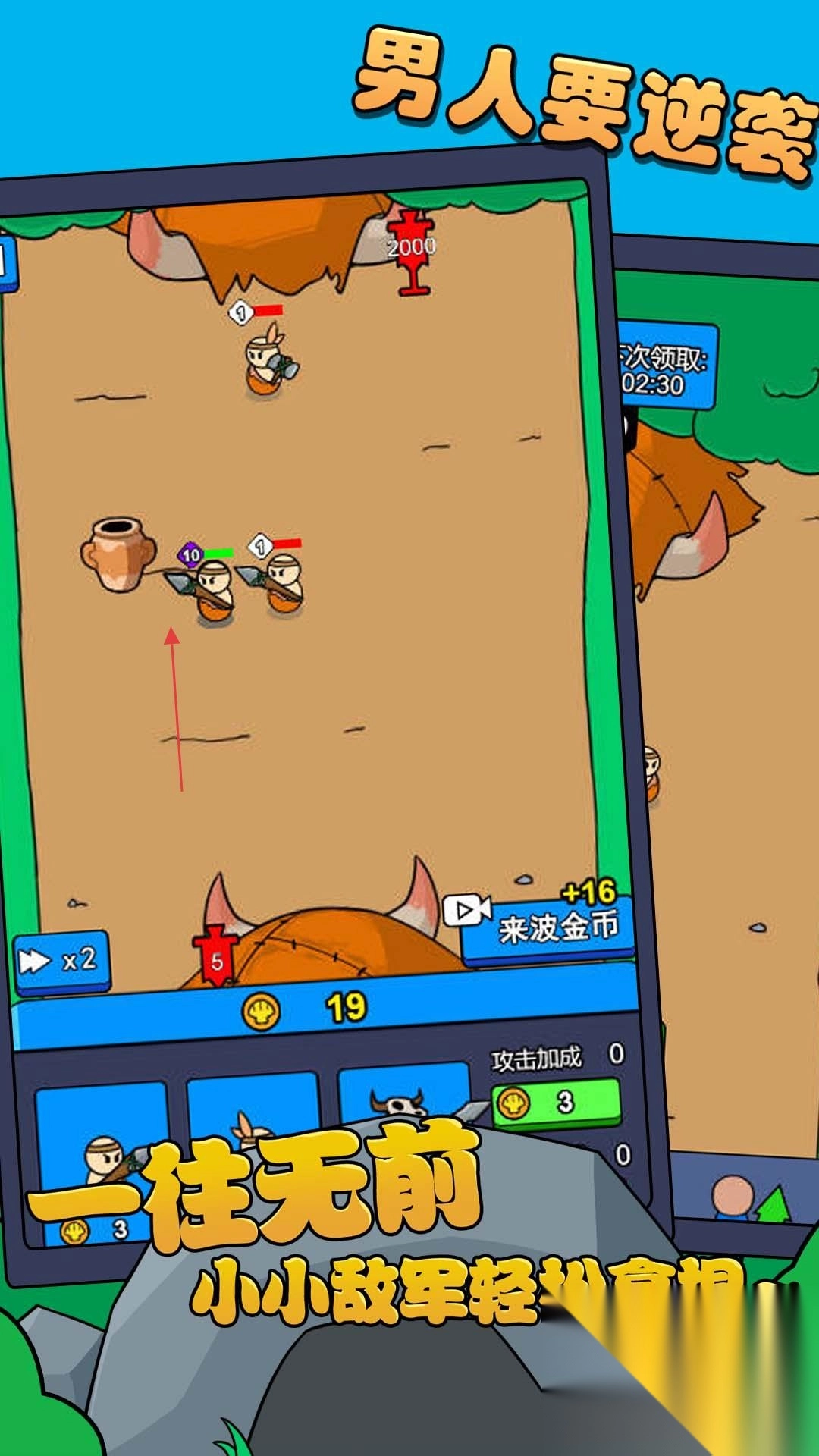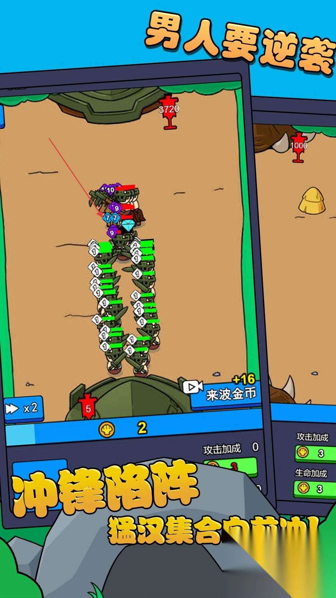 1. 掌控由众多小兵构成的兵团,轻点屏幕指挥它们朝着敌方阵地发起冲锋,凭借数量上的优势冲破防线,从而推进关卡进程。
