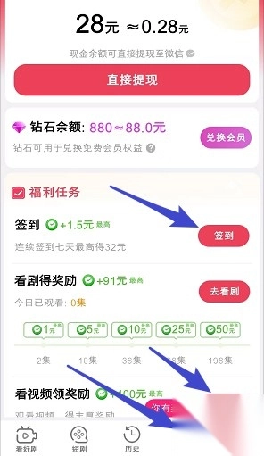 首先进行签到,之后再去观看视频以获取奖励。该奖励是以百分比的形式进行提现。
