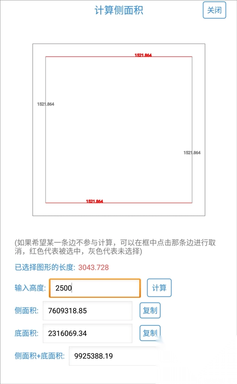 3、输入柱子高度后点“计算”,就能看到底面积、侧面积、底面+侧面3种组合面积