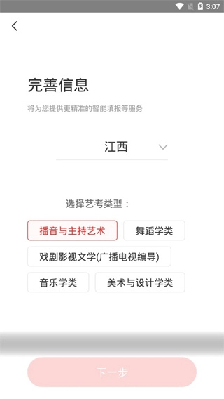 1、第一步,打开优艺考app,登录后先完善个人信息,建议如实填写,因为后续推荐将依据这些信息进行。