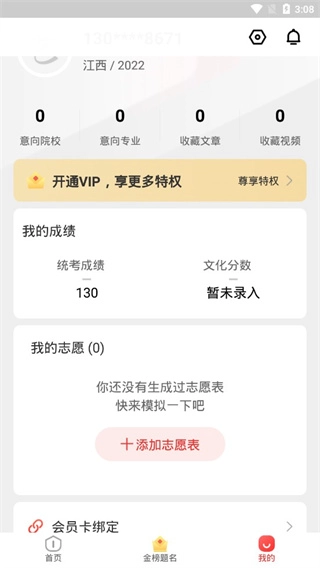 6、最后,在“我的”板块中,我们能够看到模拟志愿表,同时还能看到自己心仪的院校和专业。