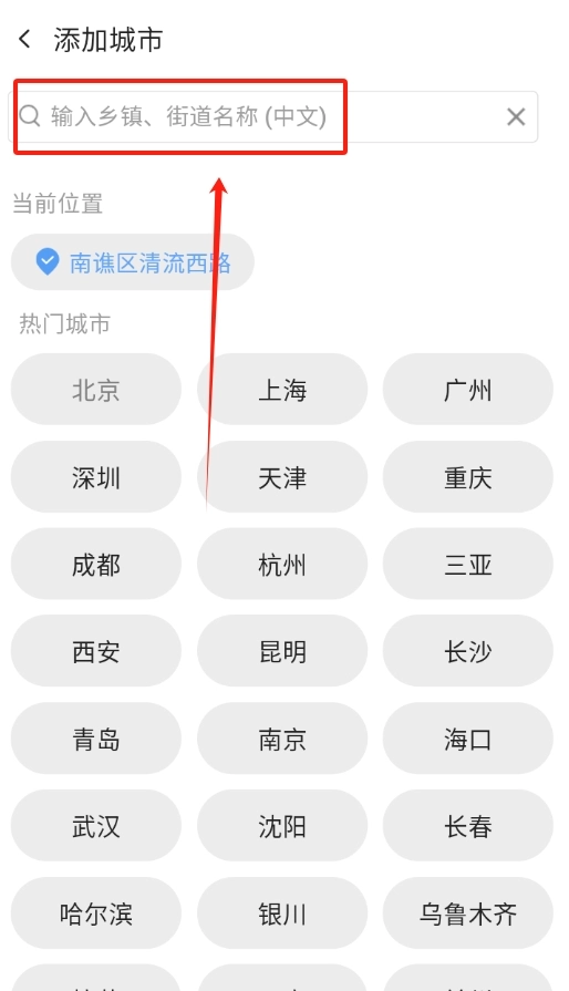 3、在搜索框中输入城市名称,输入完成后点击确定,该城市的天气便会添加到你的列表中。