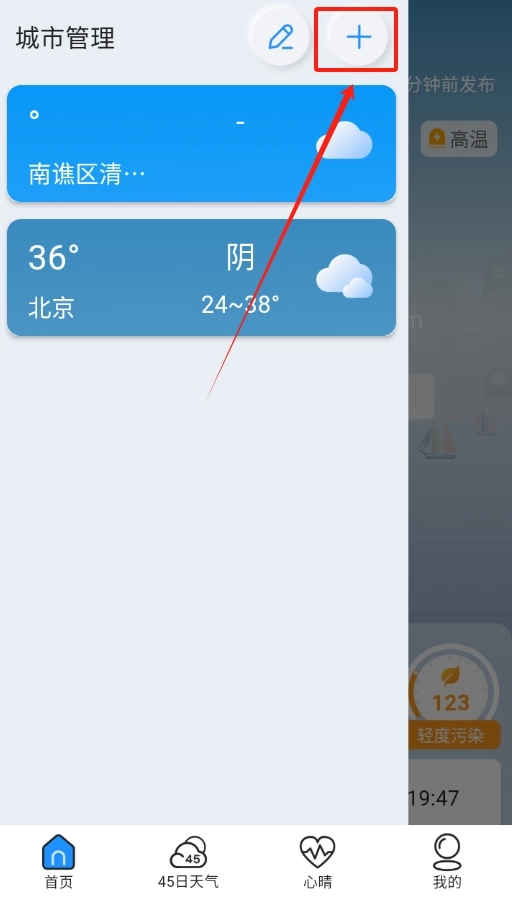 2、在弹出的菜单中,点击右上方的加号按钮,准备输入你想要关注的地点。