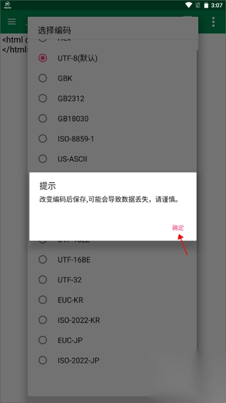3、此时,页面会弹出一则提示,内容为改变编码后保存,或许会致使数据丢失。在了解这一基本情况后,点击确定即可。