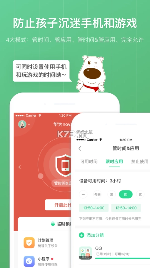 4.管理孩子使用手机应用,为你提供全面的应用管控功能。你可以禁止特定的应用使用,也可以针对应用设置可用时间段和时长,确保孩子在使用手机应用时受到适度的限制和监管。