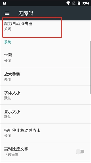 2. 进入应用无障碍设置界面,此时魔力自动点击器的状态呈现为关闭,同时该界面还设有字幕、放大手势等其他与无障碍相关的设置选项。