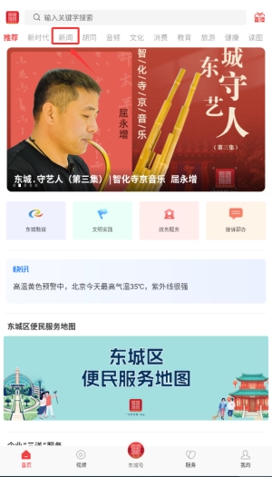 1、进入北京东城APP后,在首页导航栏选择"新闻"栏目,这里每日更新本地热点新闻。