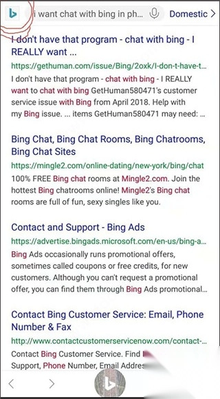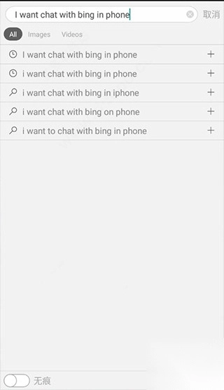 2、接着在搜索框中输入“ I want chat with bing in phone”,需注意,在手机上若输入其他文字,无法调出AI对话机器人,仅能开展简单的搜索。