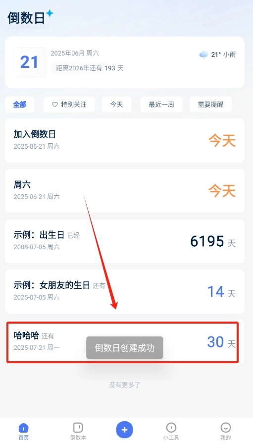 3、保存成功返回首页,刚添加的倒数日一目了然,随时都能查看还剩多少天。