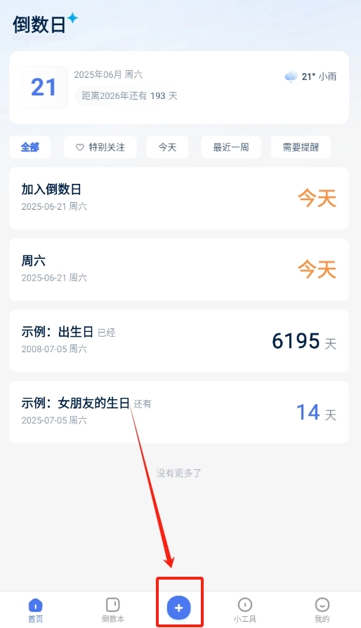 1、打开易知倒数日历,一眼就能看到底部有个加号,点它就能添加倒数日。