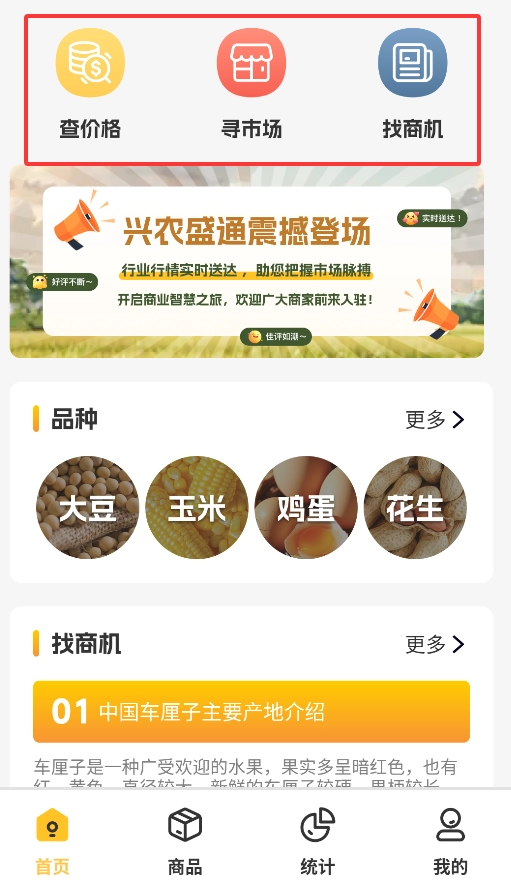 1. 启动 APP 后,首页呈现三大核心功能:实时农产品价格查询、市场供需信息浏览以及商业机会发掘。