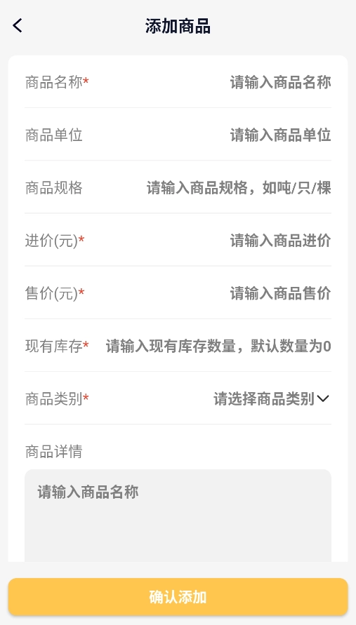2、进入"商品管理"可完善产品档案,包括品名、规格、进销价格等详细经营数据。