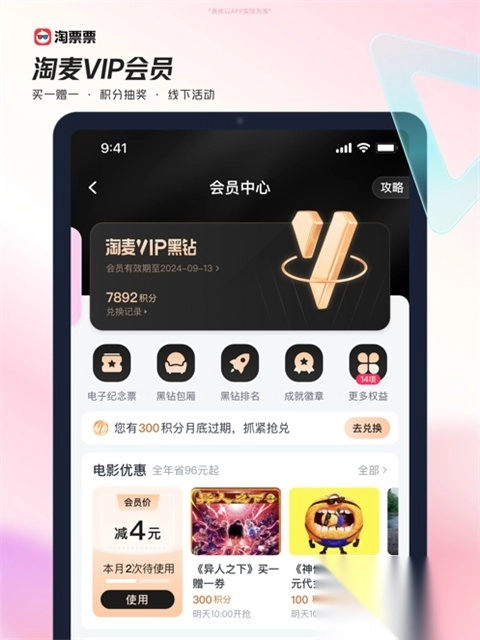 涵盖「电影 + 演出」更多福利,包含观影观演优惠券、买一送一、积分抽奖,还有丰富多样的线下活动等。