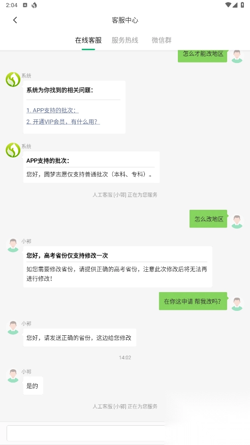 2.点击转人工,发送怎么修改地区。(仅能修改一次)
