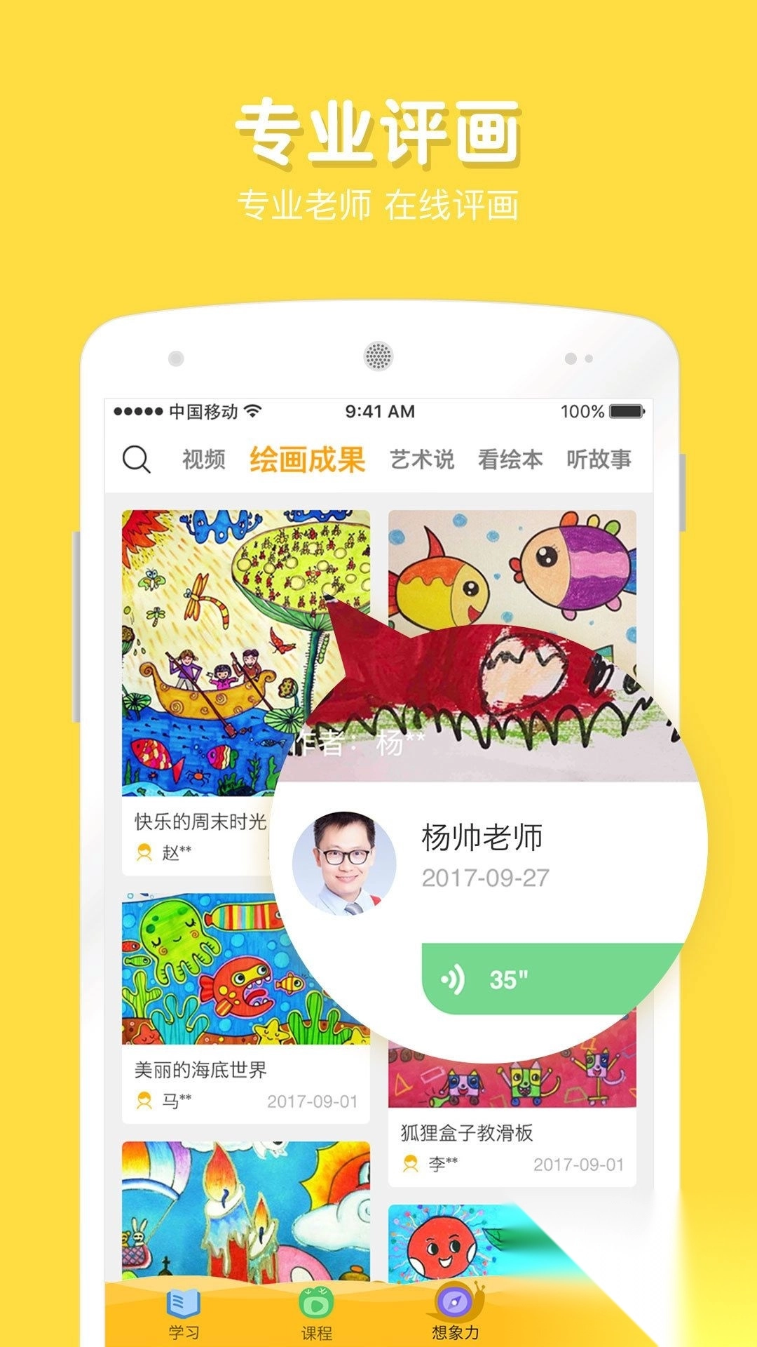 3、【作品收藏】孩子们的每一幅画作都将得到永久留存,同时会自动生成独一无二的艺术成长册,而且孩子们还能收获老师的专业点评呢。