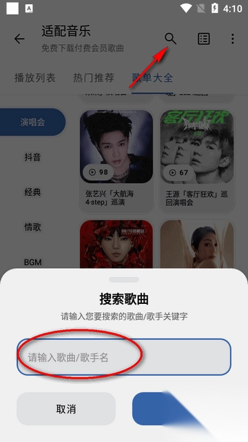 2、点击搜索可以输入歌曲或者歌手名。