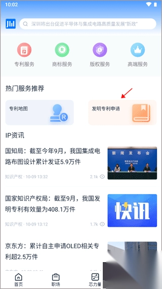 1、进入app首页,切换到知识产权模块,点击上方的“发明专利申请”。