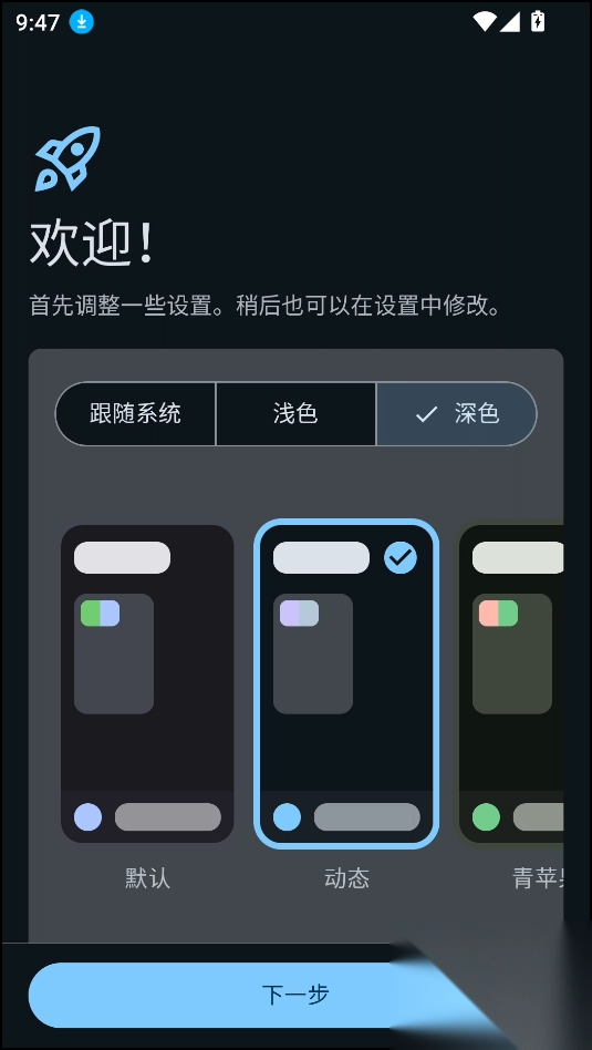 1、当在本站完成下载安装后,首次进入软件时,需进行一些基本设置。先挑选一款你心仪的主题,接着点击下一步。