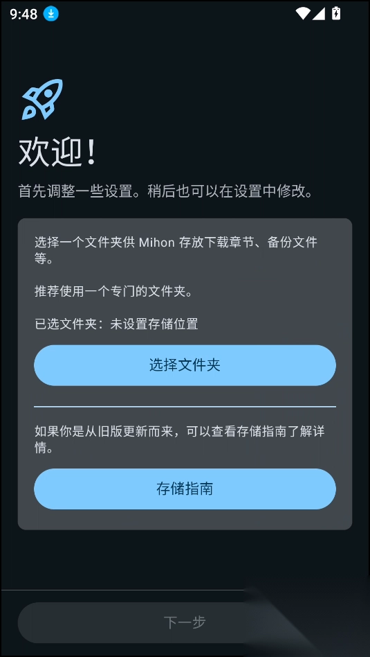 2、你需要选择一个文件夹供Mihon存放下载章节、备份文件等推荐新建一个空的文件夹。