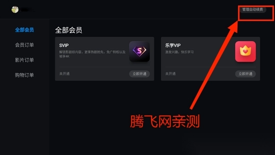 3.在全部会员界面点击右上角的管理自动续费功能,取消自动续费。