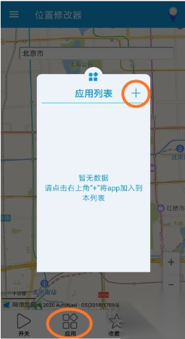 3、点击底部菜单中的"应用”,从应用列表里选择1个app启动。初始状态下应用列表里为空,点击右上角的加号(+)将需要修改位置的app加入到应用列表。添加并返回后,应用列表里就会出现刚刚添加的app。